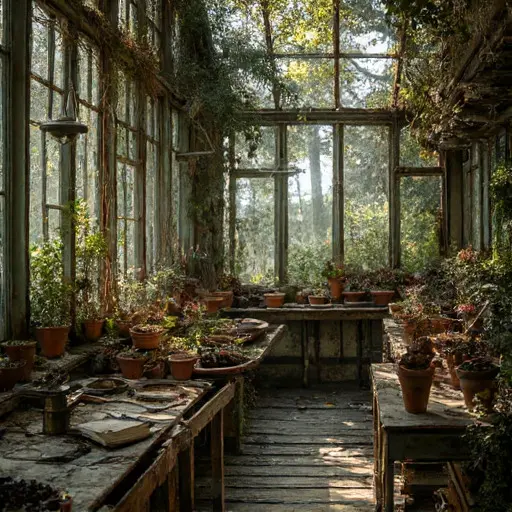 The conservatory dominates the east wing, once the center of Langley’s botanical experiments. Every object, from overturned plant trays to half-labeled seed packets, evokes unfinished work. The air carries the scent of soil and decay, a quiet testament to vanished purpose.