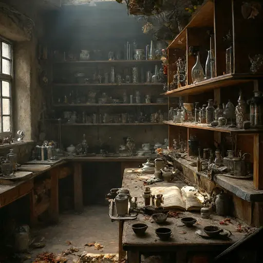 The Perfumer’s Laboratory resonates in scentless silence. On the counter, penciled draft notes for a new fragrance trail off abruptly. Every vial, mortar, and pipette embodies careful work suddenly halted, the rhythm of blending suspended in quiet stillness.