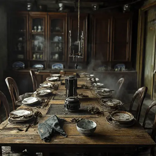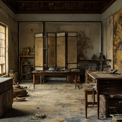 A dense quiet shadows the Calligraphy Studio, where a tipped brush rests near an unused inkstone, the pooled residue hardened into a dull, unyielding crust. Nothing appears broken, yet each untouched surface implies a halted routine.