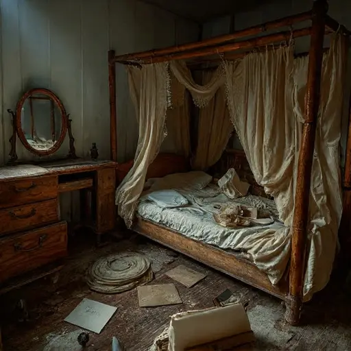 The house, surrendered to abandonment, keeps its muted pages, every stroke unfinished and echoing into stillness.