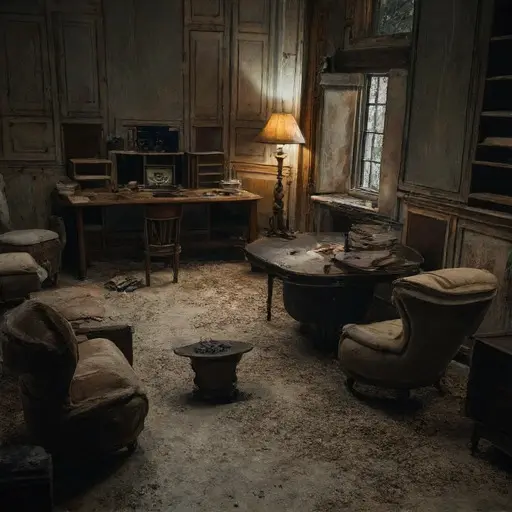 The house remains abandoned, ledgers unfinished, ink dry, quills idle, the silence of the accounting room holding the meticulous, unresolved labor of a life interrupted, the echo of routines and numbers suspended forever.