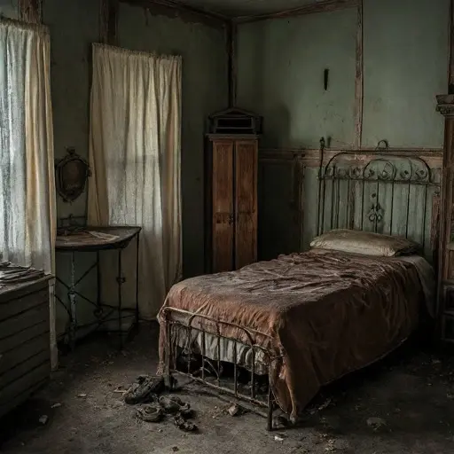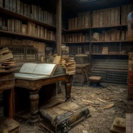 The ledger desk holds Whitman’s final entries. Columns show balanced figures interrupted by unfinished calculations. Margin notes stop abruptly, corrections unfinalized. Decline came from deteriorating eyesight combined with the stress of high-stakes audits. Clients expected completed reports; instead, partially filled ledgers linger. One drawer remains slightly ajar, revealing quills and inkpots, suspended as though awaiting the precise touch of the accountant who will never return, the quiet weight of absence almost palpable.
