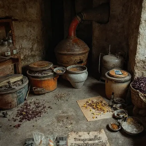 On the main counter, droppers, funnels, and glass vials lie arranged with care. Partially blended perfumes rest under cloth. A ledger beneath a tray details drop sequences, alcohol ratios, and infusion durations, each carefully dated. A half-finished bottle of amber perfume stands on a tray, evidence of work abruptly halted mid-blend, leaving nuanced aromas suspended mid-development.