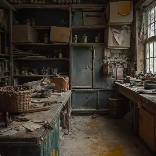 The Clockmaker’s Room exudes stillness, clocks and tools frozen mid-maintenance. A partially assembled cuckoo clock leans against the bench, its tick sequence left incomplete.