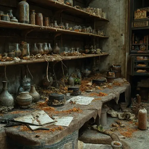 Educated in classical sciences and herbal medicine, he belonged to the middle class and maintained a tidy, reputable shop. Physical traces remain: a cracked mortar, stained pestles, ledger with meticulous entries, brass scales slightly tarnished, velvet-covered specimen jars, loose powdered herbs on counter, and a faded coat hung by the door. His mother, a local herbalist, influenced his career choice. Daily habits included preparing formulas, weighing compounds, and recording prescriptions. He was precise, methodical, yet private, increasingly anxious as his business faced competition.