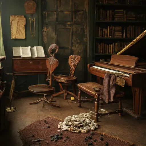 One dusk left faint yet insistent signs. On the piano’s lid rests a marked conductor’s score—its overture annotated with confident cues, its final movement crossed by erratic arrows and circled mistakes. A tuning fork lies dented along its stem. A bow screw has fractured, its grooves worn thin.