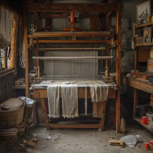 The absence of movement leaves a quiet tension, as if the room remembers hands no longer present, every fabric fold preserving the memory of interrupted labor. Even the edge of a partially woven panel shows a slight curl where fingers last pressed the threads.