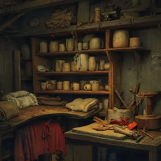 A tartan draft pinned to a wall sags at one corner, as though rechecked too often. Dyed wool rests on former card tables in small, careful heaps. A tin of starch sits uncapped near rulers marked with Gaelic script. The treadled frame bears faint scratches where Ewan tested tension. A shuttle loaded with crimson yarn lies beside a strip whose pattern drifts off-count, hinting at an unseen strain.