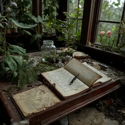 The Conservatory Study exudes the quiet of paused investigation. On the central manuscript, the word manuscript is repeated in pencil annotations, some crossed out, some left unresolved. The keyword guided each cataloged specimen.