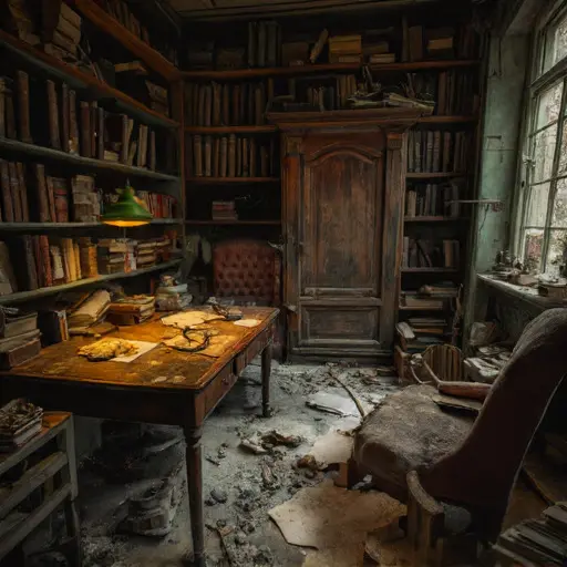 The house remains abandoned, manuscripts untouched, books unread, inkpots unmoved. The library nook preserves the memory of a life devoted to language and scholarship, ended when fingers failed, routines indefinitely suspended, leaving philological work unresolved, eerie, and haunting through absence.