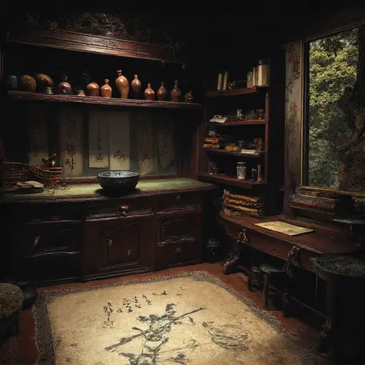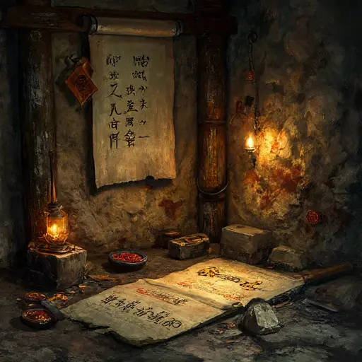 A narrow board beneath the writing desk shifts under gentle pressure. Inside the hollow space rests a bundle wrapped in linen. Within lies a small scroll of such fine paper it appears translucent. Only two characters are inked on it, both abandoned halfway through their curves. A note is tied around the scroll: “For Aiko—left unfinished until truth returns.” The kanji for “truth” is incomplete, halted mid-brush.