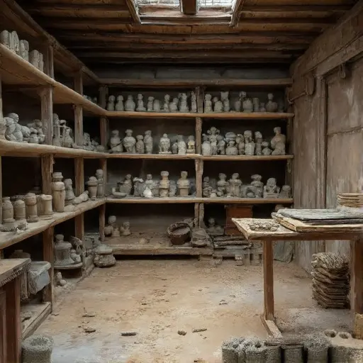 On the worktable, half-finished cast busts sit beside tools used to carve fine details. Powdered pigment jars are open but untouched, brushes stiffened with dried residue. A partially modeled clay figure remains on its stand, fingers carefully shaped yet unrefined. Dust has settled into each groove and imprint, preserving the moment of sudden abandonment and interrupted creation. Light from the small window glances off hardened plaster, illuminating small cracks in models left unrefined.