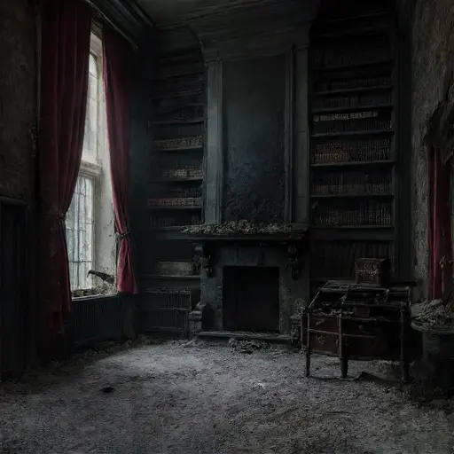 Cinder Ashlar is a house of stark contrasts: magnificent stone architecture rendered uniformly bleak by the constant residue of smoke. This abandoned Victorian house, built in a remote, desolate clearing, is characterized by its oversized chimneys and an unusual lack of interior wood—a structure deliberately fire-resistant. The atmosphere inside is overwhelmingly olfactory, smelling deeply of cooled embers, fine soot, and a metallic bitterness, like burned paper. The constant dust and the pervasive darkness create an eerie sense of deliberate concealment. The silence here is not empty, but heavy with the weight of things destroyed, giving the entire structure an air of profound, necessary secrecy and suspense.