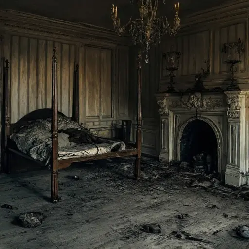 The master bedroom provides the final, personal insight into Bartholomew’s work. The room itself is damaged; near the main hearth, the wooden floorboards are deeply charred, suggesting a localized, intense fire was set. This was not accidental.
