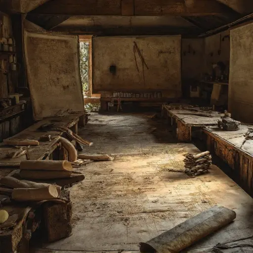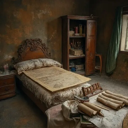 The Cartographer’s Chamber holds the hush of unfinished journeys. On a table, penciled contour lines for a mountain range trail off mid-sweep. Every ruler, compass, and parchment embodies meticulous work abruptly paused, the rhythm of mapping frozen in quiet anticipation.