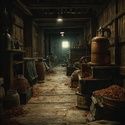 A hush settles like dust along the rafters. A copper still on the central table shows a drip frozen mid-fall, glaze dulled where heat once shimmered. A glass vial rests on its side, a thin line of liquid creeping toward a warped floorboard.