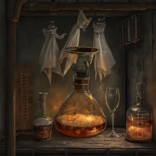 One late evening left unmistakable traces. A copper still displays scorch marks where the flame grew too hot. A filtering cloth lies collapsed, stained by a heavy spill from a tincture that should have run clear. A delicate balance scale sits unbalanced, one brass pan heavier though empty of herbs.