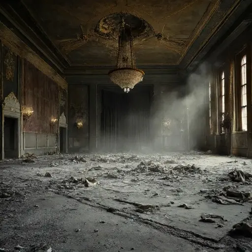 The atmosphere inside the Harrowgate Folly is profoundly cold, an absolute, heavy silence saturated with the dry, sharp scent of antique wallpaper and decaying wood. The Main Entrance Hall is an immediate declaration of arrested time. A massive, intricately carved hall table stands near the sweeping staircase, upon which rests a bronze tray holding a scattering of brittle, yellowed calling cards, their corners curled.