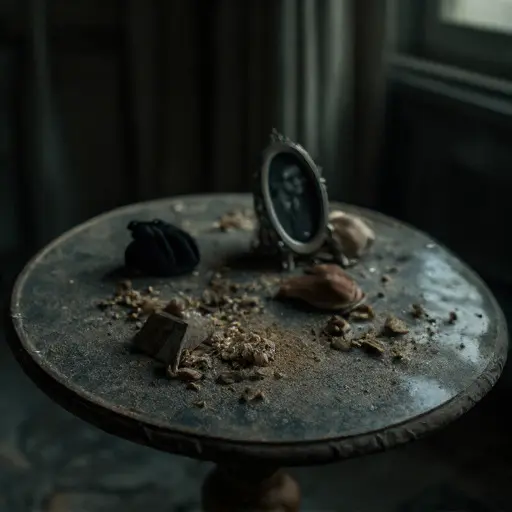 The financial evidence of Alistair’s ruin—a direct result of his fear of public disgrace—is found in the Ground Floor Study. On the heavy, carved oak desk, a small, dark leather wallet lies open, its contents spilled out: a scattering of brass coinage and, more importantly, a thick stack of tightly rubber-banded unpaid bills for basic household services (coal, gas, water) dating back several years. The bills, covered in a permanent layer of dust, are a silent testament to the extreme financial precarity he hid while maintaining his grand public facade.