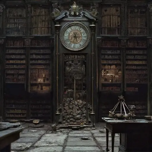 In the exact center of the floor is a large, circular brass plaque, set into the wood. The plaque is smooth, tarnished, and entirely blank. Resting on the very edge of the plaque is a final, simple object: a small, antique pocket watch. The hands of the watch are frozen precisely at midnight, and the winding key is missing. Chronos Folly stands as a monument to the failure of absolute control, preserving the haunting silence and profound melancholy of a brilliant mind that mapped the entire universe, only to find the ultimate, terrible answer was the cessation of time itself.