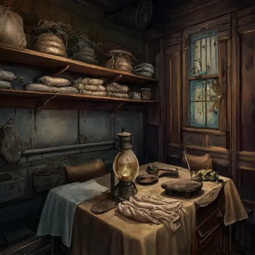 In the Dining Parlour, a set of wooden boards—unused but wiped with beeswax—indicates care and something like pride in presenting work neatly. A folded apron on a chair bears faint impressions of its former wearer’s motions, and a recipe slip written in Polish script lies beneath a bowl of coarse salt. Everything suggests a man deliberate, restrained, and quietly protective of his craft.