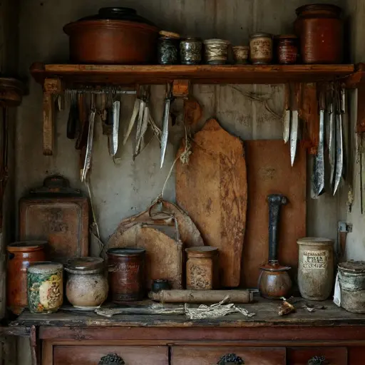 Traces across these furnished spaces shape the outline of Stanisław Piotr Zielinski, born 1871 in Kraków, trained in modest market stalls before taking private commissions. In the Pantry Nook, rows of Polish-labeled spice tins—jałowiec, majeranek—stand precisely grouped. A sharpening steel with a carved, regional pattern rests near a set of knives wrapped in waxed cloth, each blade accustomed to slow, careful honing. His routines seem steady: dawn trimming, midmorning jointing, evenings spent wrapping parcels at a steady rhythm.