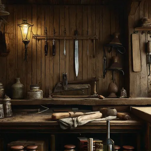 Back in the Butcher’s Room, the misaligned cleaver beside the whetstone becomes the room’s keystone. The block’s grooves shift subtly near its edge, revealing the start of a cut never carried through. A trussing needle lies out of place on the floor, its arc whispering of a startled gesture or a tense reconsideration. Even the apron folded on the stool seems off-center, as though replaced by someone whose hands trembled ever so slightly.