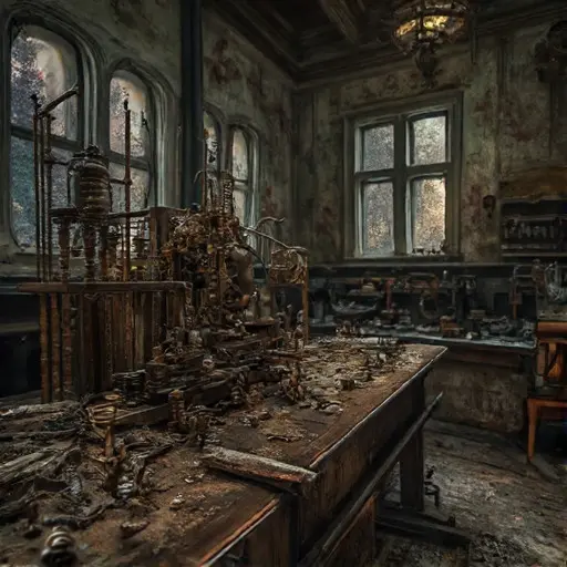 Rusted-Lyre Keep was an architectural study in mechanical melancholy: a massive, asymmetrical structure of dark red brick, characterized by numerous internal chambers designed to isolate sound and vibration. Its name suggested a blend of corrosive decay and a silent, musical instrument. The house sat low in a wet, perpetually misty valley, giving its metalwork a constant, dull sheen of oxidation. Upon entering the main workshop, the air was immediately cold, thin, and carried a potent, almost dusty scent of old machine oil, aged felt, and a sharp, metallic tang. The floors were rough, slate flagstones, amplifying every faint sound into an unsettling echo. The silence here was not merely quiet; it was an intense, mechanical stillness, the profound hush that enforces the memory of a delicate, rhythmic music suddenly halted. This abandoned Victorian house was a giant, sealed clockwork device, designed to achieve and hold a state of perfect, unchangeable, automated rhythm.