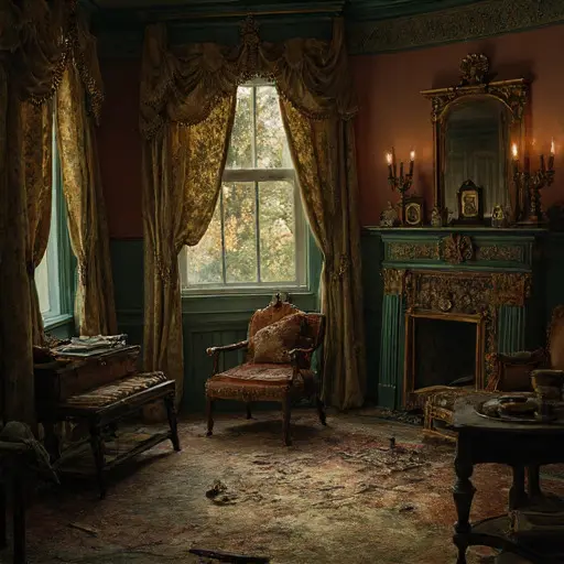 But the growing demand for Thaddeus’s expertise overwhelmed him. Commissions piled faster than he could complete them. His once-neat sketches tightened into crowded lines; correction marks scarred pages he once kept immaculate. Evadne’s sudden illness fractured the last of their structure. After her passing, Lucilla went to live with relatives, leaving her belongings where they naturally fell. Thaddeus remained only a short while longer before quietly abandoning his workshop mid-task. Fellmarrow House has not shifted since.