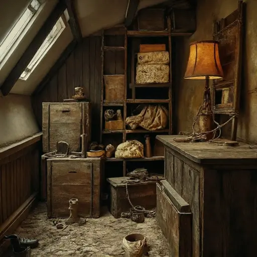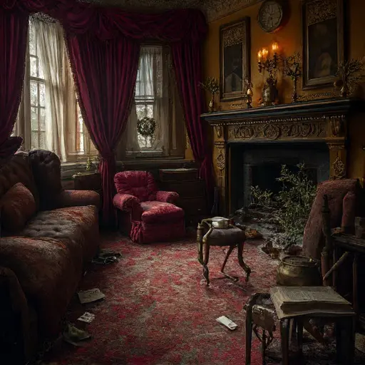 The parlour’s air carries a faint sour sweetness—old ink, collapsed fabrics, the mineral hush of long-standing dust. Nothing here suggests flight or panic. Fenloren House feels paused, its routines gently abandoned rather than broken, every object resting in the exact position last touched.