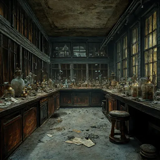 Toxin-Stasis Keep was an architectural statement of lethal control: a massive, asymmetrical structure built of dark, heavy granite, characterized by numerous internal chambers designed to isolate volatile substances and contain catastrophic reactions. Its name suggested a blend of poison and a state of absolute equilibrium/stoppage. The house stood low in a remote, heavily wooded valley, giving it a perpetually shadowed, secretive appearance. Upon entering the main chemistry lab, the air was immediately thick, cool, and carried a potent, almost dusty scent of aged wood, evaporated alcohol, and a sharp, sweet tang of residual organic toxins. The floors were covered in heavy, smooth tiles, now slick with dust and dried chemical residue, amplifying every faint sound into an unsettling echo. The silence here was not merely quiet; it was an intense, chemical stillness, the profound hush that enforces the memory of a reaction perfectly balanced, waiting for the final, critical equilibrium. This abandoned Victorian house was a giant, sealed crucible, designed to achieve and hold a state of absolute, unchangeable, molecular stability.