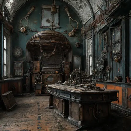 Chronos-Cessation Keep was an architectural statement of anti-duration: a massive, symmetrical structure built of pale, smooth granite, characterized by numerous internal chambers designed to eliminate all progression, decay, and movement for concentrated contemplation of Eternal Static Existence. Its name suggested a blend of time/duration (Chronos) and a complete stopping/ending (Cessation). The house stood on a remote, high, isolated mesa, giving it an atmosphere of complete intellectual detachment, perpetually dedicated to the singular pursuit of Absolute Non-Change. Upon entering the main temporal studio, the air was immediately thick, cool, and carried a potent, mineral scent of aged metal, fine dust, and a sharp, metallic tang of brass. The floors were covered in heavy, smooth tiles, now slick with dust and grinding residue, amplifying every faint sound into an unsettling echo. The silence here was not merely quiet; it was an intense, temporal stillness, the profound hush that enforces the memory of a moment perfectly fixed, waiting for the final, unassailable absolute zero of duration. This abandoned Victorian house was a giant, sealed clock, designed to achieve and hold a state of absolute, unchangeable, fixed cessation of all temporal flow.