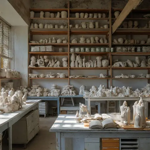 The porcelain atelier is suspended in quiet stillness. On a central table, a half-formed figurine rests, its molding lines unfinished. Sculpting tools lie meticulously arranged, brushes poised beside jars of glaze, the room echoing absent rhythms of the artisan’s craft.