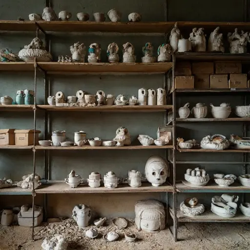 Clay figures and unfinished figurines remain untouched. A ledger beneath the worktable lists client orders and molding sequences but ends abruptly. Dust coats half-painted pieces, brushes stiffened with dried pigment, and jars of glaze remain closed, poised for use that never came. Small sculpting knives rest atop a folded cloth, tools waiting in mid-gesture.