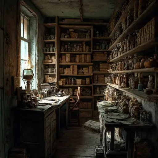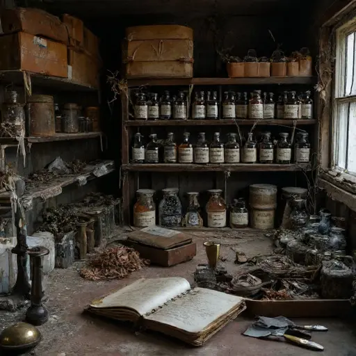 The Apothecary carries a silent tension, where the last penciled compound in a ledger stops mid-formula, leaving mixtures only partially documented. The faint aroma of dried herbs and medicinal resins lingers, a residue of interrupted care.