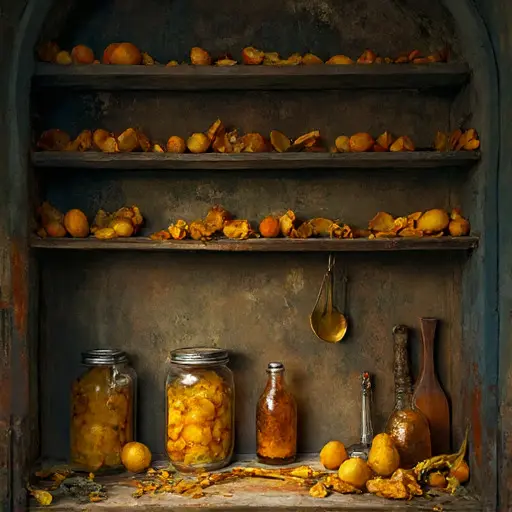 The citrus cellar breathes faint steam, orange rind, and the sharp tang of overcooked sugar. Lanternlight wavers over every tool, as though unsure where the last steady action ended.
