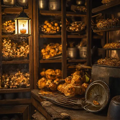 A tray of candied peel darkens too far at one end, glistening under uneven light. A thermometer sits askew in its stand, tip stained with crystallized sugar. A copper ladle leans against the counter, its bowl dulled by repeated, uncertain stirring. Even the lantern’s flame bends toward the stone wall, shadowing a shallow pan where syrup settled in a slant, its once-balanced measure drifting off-center.