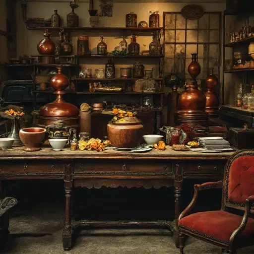 As commissions grew, Clémence faced subtler pressures. A merchant’s accusation—implying her prized extrait mimicked another’s formula—left a stain deeper than spilled essence. In the pantry alcove, a bottle of costly attar lies cracked and seeping into warped boards. Étienne’s apron bears scorch marks not matching any burner nearby. A drawer of fragrance trials shows abrupt crossings-out, her elegant script collapsing into hurried strokes. At the back, a locket containing a dried sprig has snapped open, its chain snarled around a brass vial.