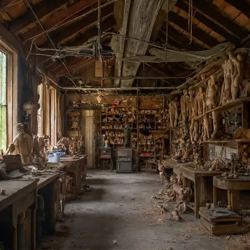 A brittle hush settles over the Dollmaker’s Loft, where a thin scatter of sketches surrounds a block of linden wood. One sheet bears a penciled pattern, abruptly broken off as if a final contour proved too difficult to settle.