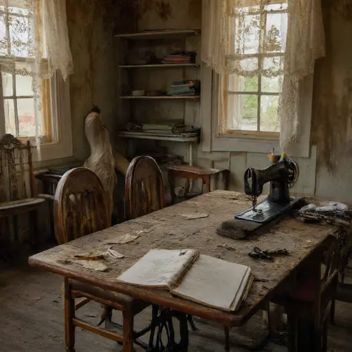The sewing parlor carries the weight of interrupted labor. On the table, pinned fabrics await stitching, and the draft notebook remains open mid-design. Scissors and pins rest as if last touched moments ago, the rhythm of routine paused permanently.