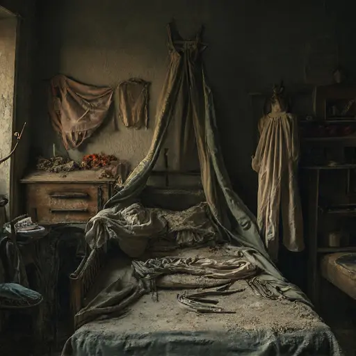 Fabric scraps lie piled, some partially cut, some stitched. The draft notebook ends mid-sketch. Pins are embedded in tables and cloth, scissors left open, thread tails curling across surfaces. A small box of buttons sits unopened. Even minor corrections—erasures, retaken stitches—remain incomplete. The parlor, once filled with purposeful motion, now holds only quiet, ordered suspension.