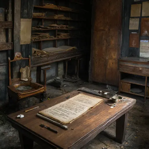 Desks hold partially inked scrolls and scattered tools. Brushes, inkstones, paperweights, and rulers lie stiff with dust. Stacks of prepared rice paper rest nearby. Haruto’s ledger, weighed down by a carved stone paperweight, details client names, project notes, and script styles. Dust settling over implements emphasizes abrupt cessation of repeated, precise gestures, silence accentuated by half-finished calligraphy and displaced instruments.