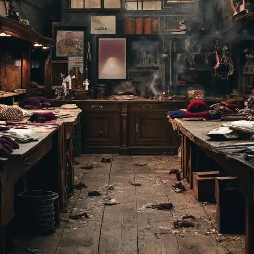 Stillness lies over every block and spool. On the central table, an unfinished hat crown sits stitched on one side, but its opposite seam pulls crookedly, revealing a faint gap. A feather fan rests beside it, two quills bent as if pressed too hard.