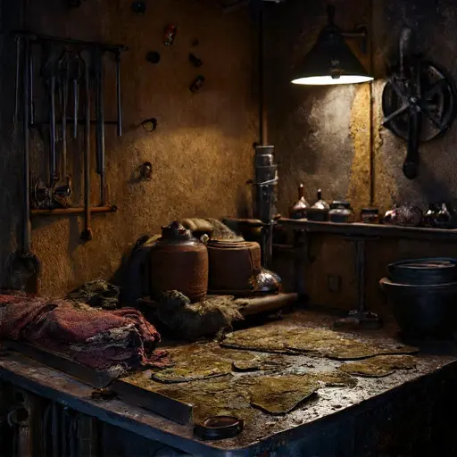 Soft disruptions surface elsewhere. In the Upper Washstand Chamber, a bowl of cooling water shows a cloudy ring—evidence of quenched tools forgotten too long. A letter from Prague, its seal broken and ink blurred, rests beside a cracked mirror. On the Guest Cot, a travel coat encloses nothing but a protective glove and a broken paddling block, neither sufficient for real departure nor casual storage.