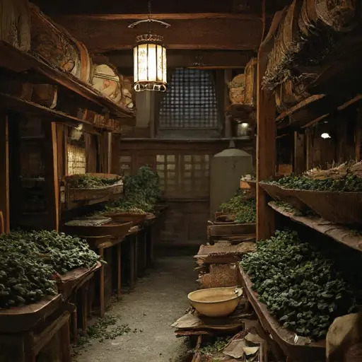 This tea-fermentation room preserves the rituals of Hwang Seong-min, tea master and small-batch processor, born 1874 in a village outside Jeonju. Raised among modest farmers, he apprenticed with traveling blenders who taught him the quiet geometry of oxidation, temperature, and timing. His temperament remains etched across these shelves: tasting bowls arranged by season, carved tea paddles oiled to a mellow sheen, and a sachet of roasted barley kept for his younger sister, Hwang So-yeon.