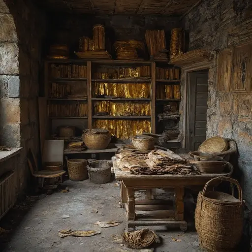 On the writing desk, quills and rulers lie aligned; inkwells are placed in order of color and consistency. Shelves hold parchment sheets stacked by project; wax seals and letters remain carefully arranged. A partially inscribed plate rests weighted under a wooden block, reflecting István’s suspended work. Dust collects in ink grooves and indentations from repeated hand movements, preserving faint impressions of halted practice.