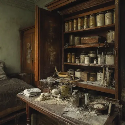 The house remains abandoned, vials, powders, and scales awaiting hands that will not return, the quiet heavy with unfinished remedies and lost mastery.