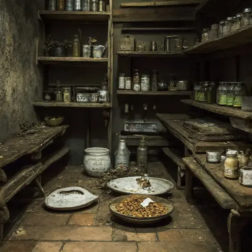 Workbenches hold partially measured powders and scattered vials. Mortar and pestle sets, funnels, and spatulas lie stiff with residue. Labeled jars of dried herbs and minerals sit nearby. Lucia’s ledger, weighed down by a small brass scale, details ingredient names, dosages, and client instructions. Dust settling over implements emphasizes sudden cessation of repeated, exacting motions, the silence accentuated by half-prepared remedies and tipped glassware.