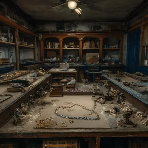 The house remains abandoned, tools and gemstones frozen mid-creation, preserving the quiet persistence of jewelry craft interrupted, unresolved, and suspended in hushed neglect, a testament to meticulous artistry left unfinished.