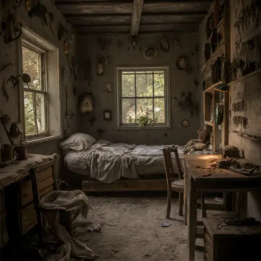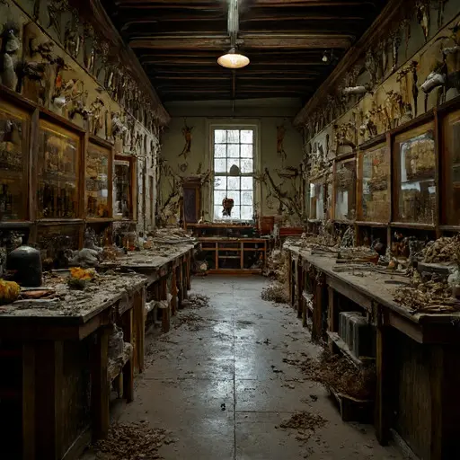 The final discovery is the stillness of interrupted study. No explanation survives. The house remains abandoned, specimens idle, mounts incomplete, and every ledger frozen mid-entry, a testament to halted labor, disrupted vocation, and unresolved taxidermy expertise lingering quietly in every room.
